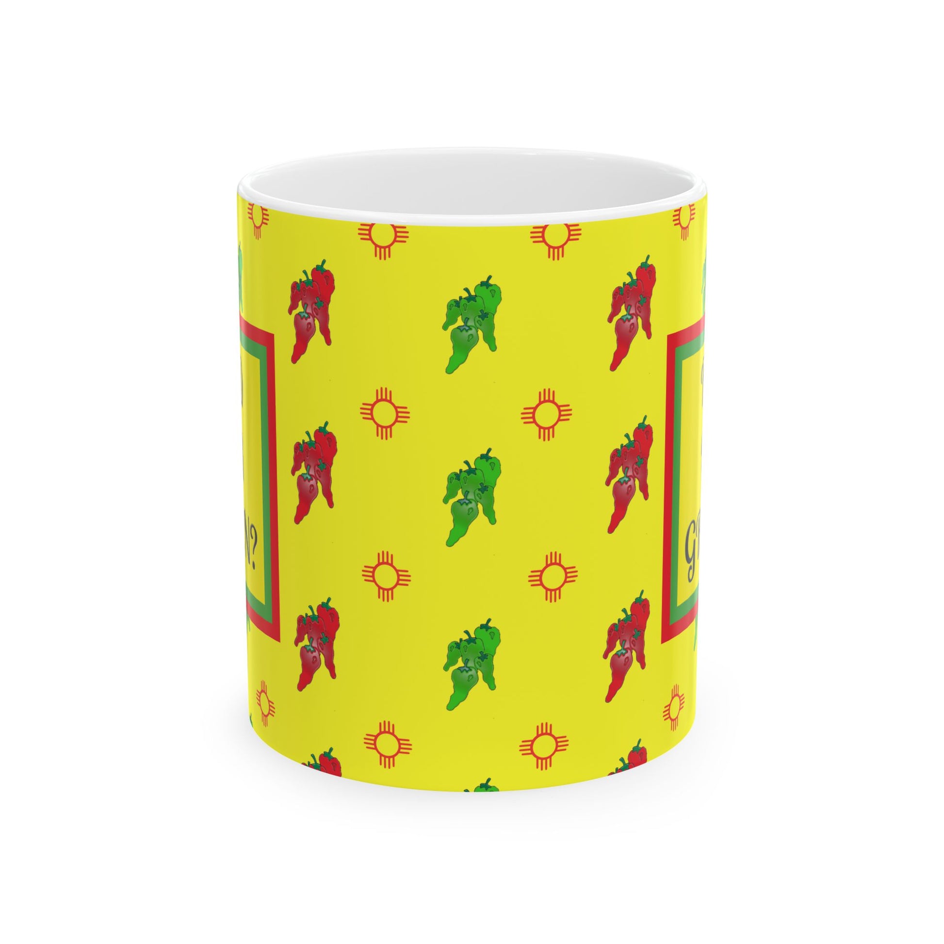 A vibrant and eye-catching New Mexico design ceramic mug with the state question printed on it. This mug is perfect for anyone who loves New Mexico or wants to add a pop of color to their morning routine. Ideal for coffee or tea lovers and makes a great gift for New Mexico residents or visitors. Relevant for holidays such as Christmas, birthdays, and souvenirs.